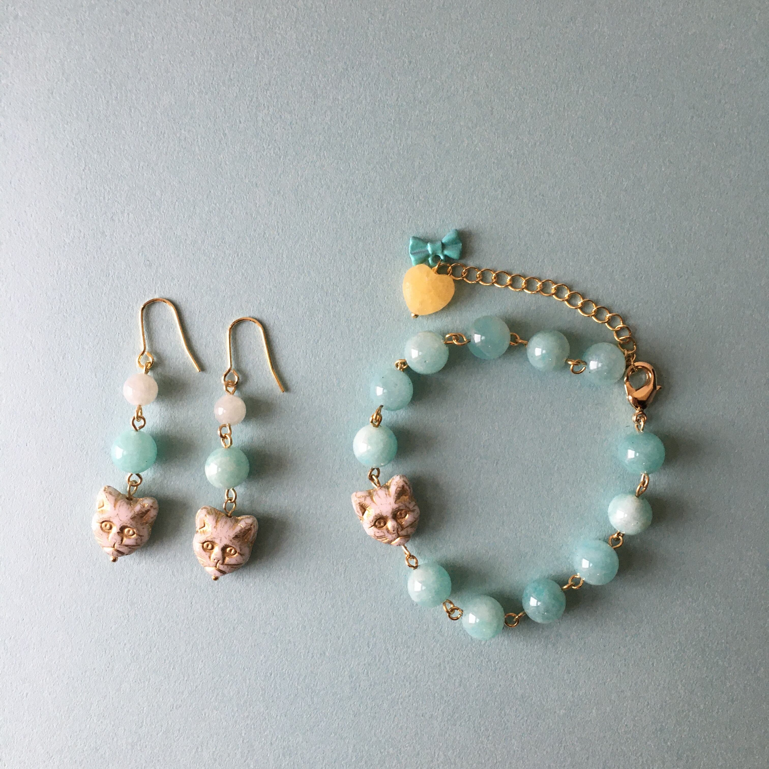 お顔が可愛い猫のモチーフと天然石を組み合わせた大人可愛いピアスです