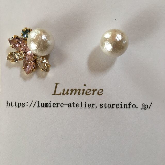 片側のみスワロフスキーのビジューが付いたコットンパールのピアスです。