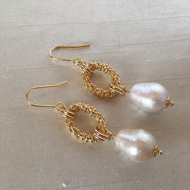 コットンパールとオーバル型のゴールドリングのピアスです。