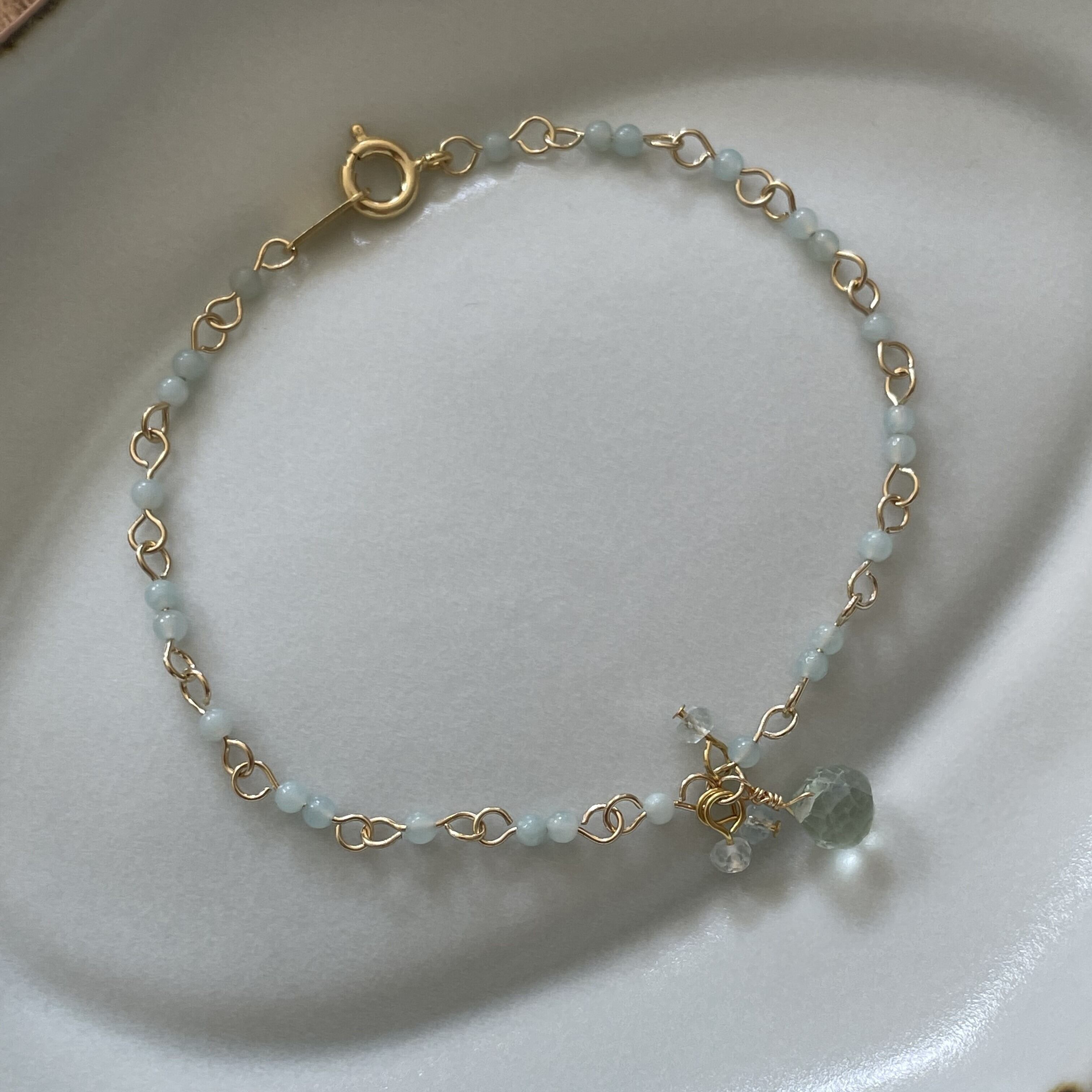 色味が優しい小さなアマゾナイトとオニオンカットが美しいフローライト、透明度のあるボタンカットのアクアマリンを組み合わせた乙女心をくすぐるブレスレットです