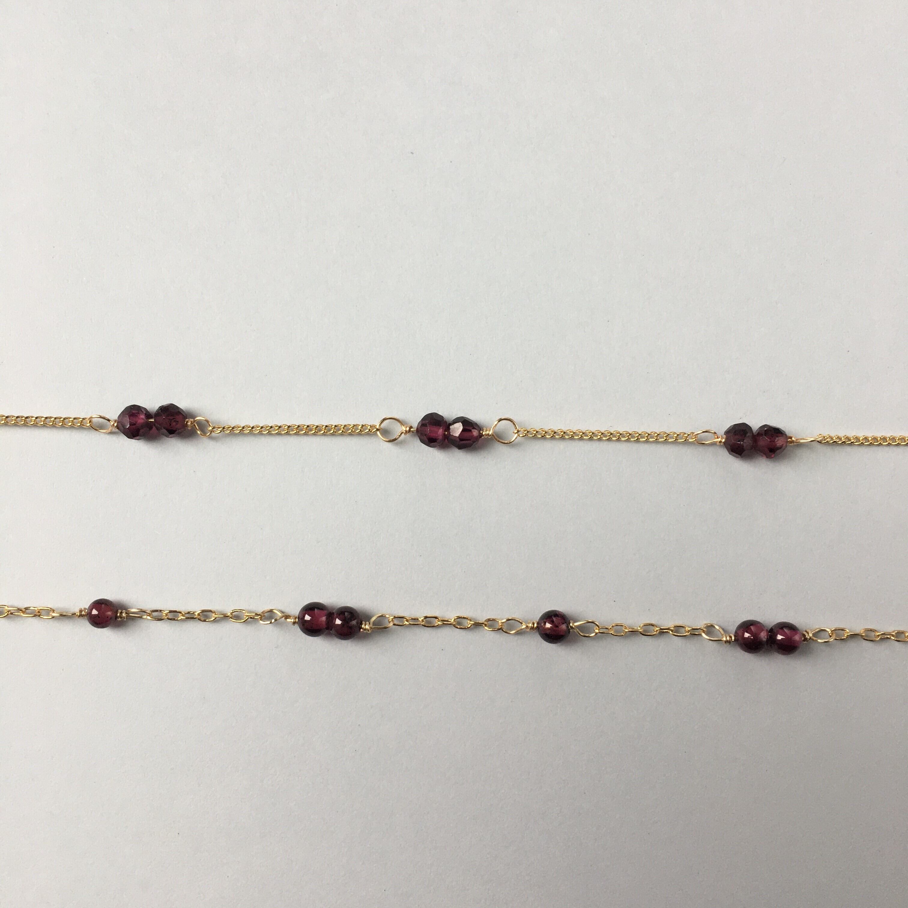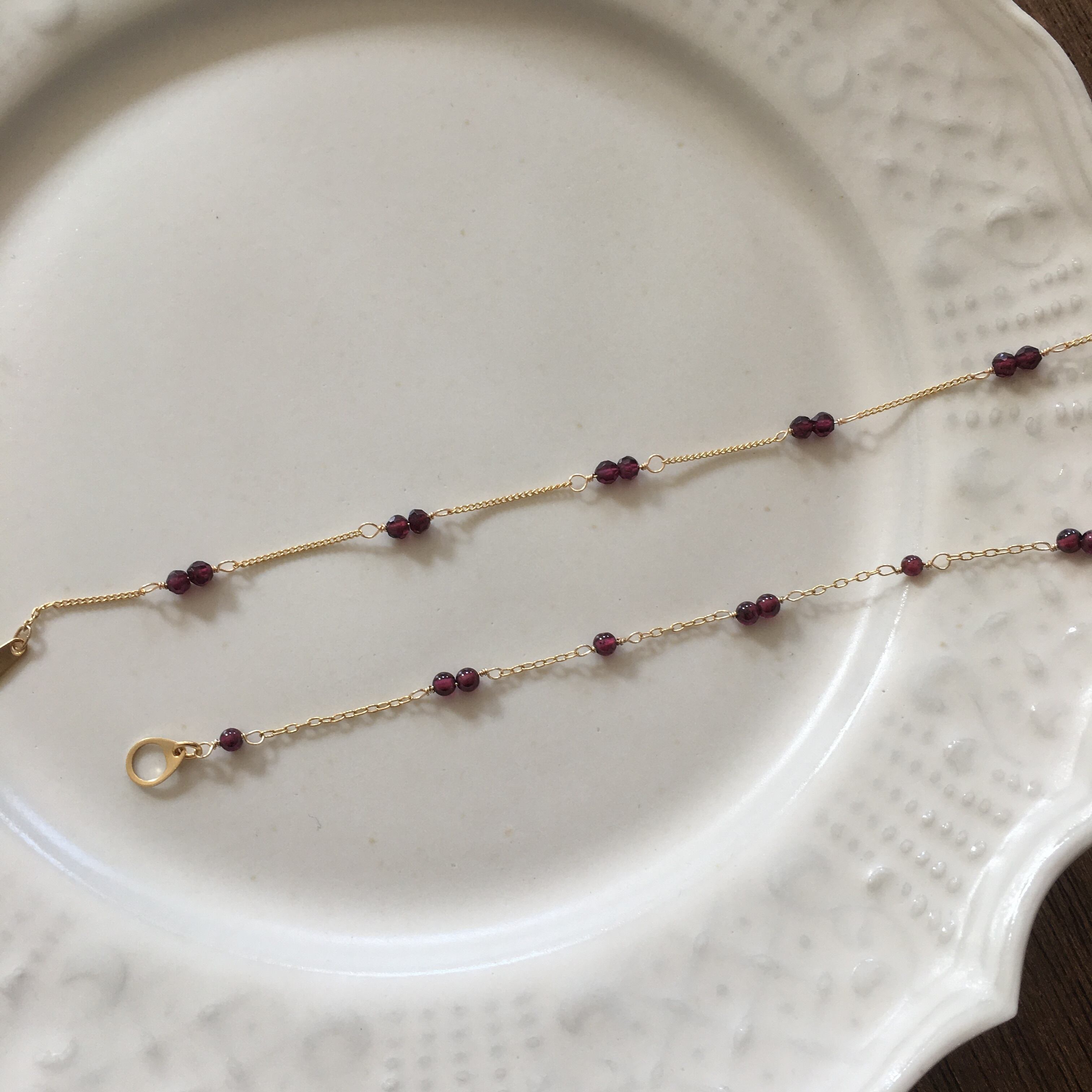 小さなガーネットをめがね留めで繋ぎ合わせたシンプルなブレスレットです