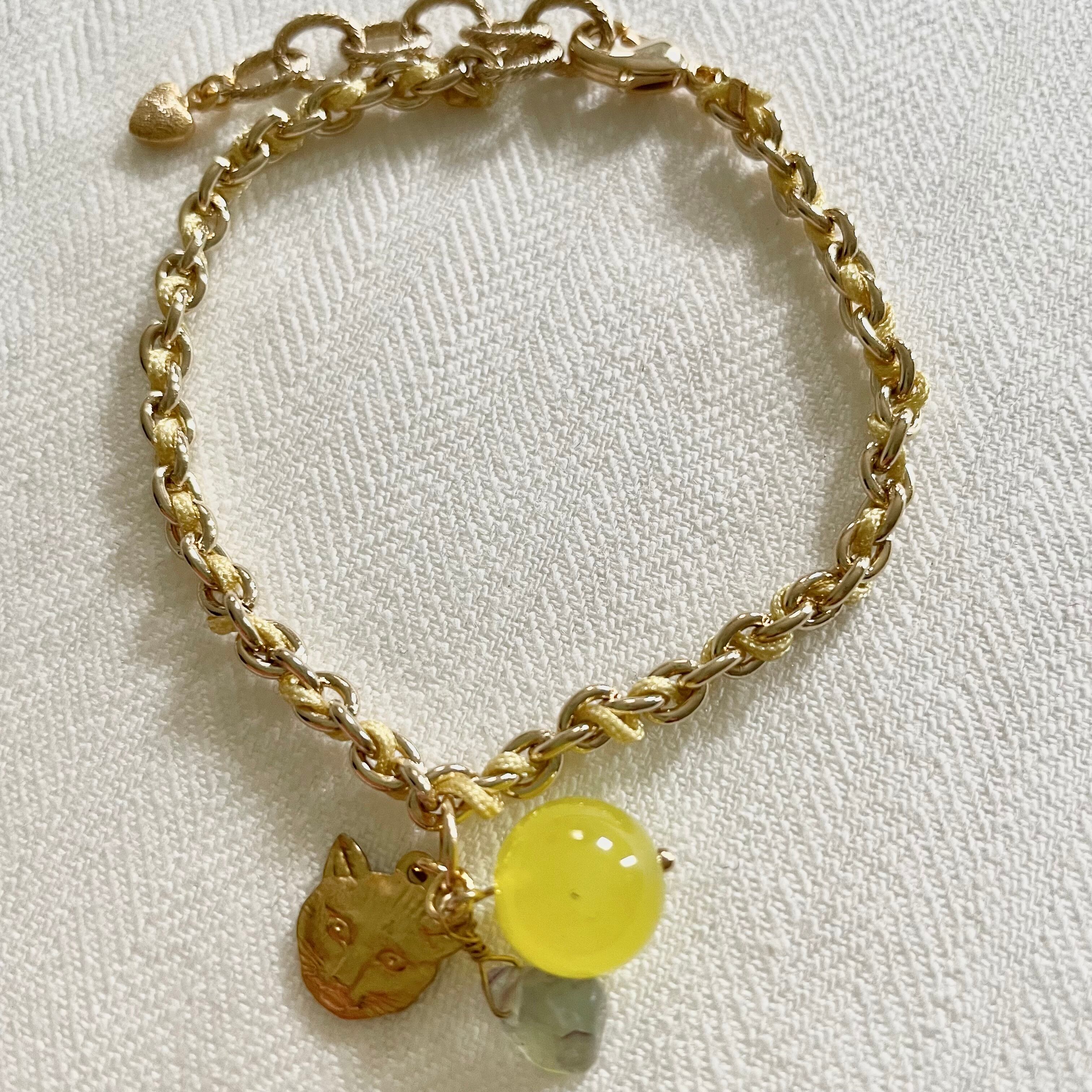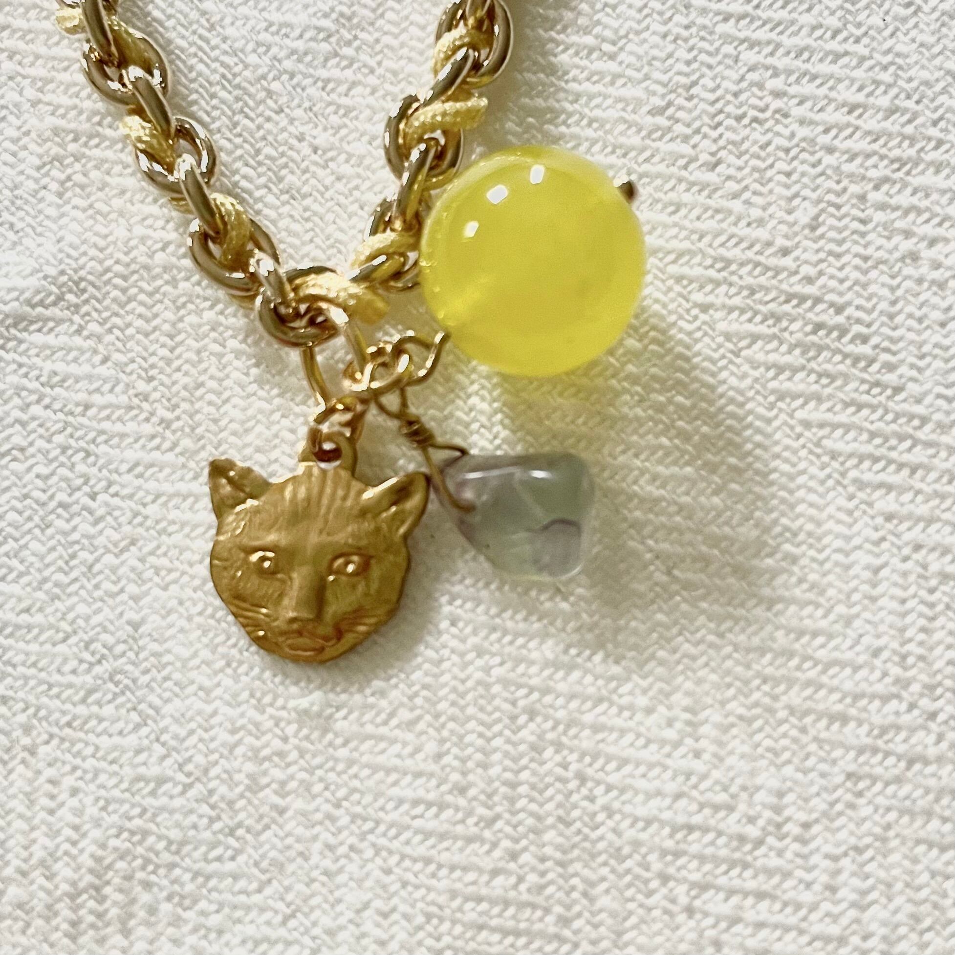 アメリカ製の可愛いブラス猫チャームをメインに、明るい黄色のイエローアゲートと